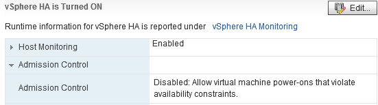 vCenter Server uses admission control to ensure that sufficient resources are available in a cluster to provide failover protection and to ensure that virtual machine resource reservations are respected. There are three types of admission control. For this explanation, weβll just focus on vSphere HA. vSphere HA ensures that sufficient resources in the cluster are reserved for virtual machine recovery in the event of host failure. Admission Control imposes constraints on resource usage and any action that would violate these constraints is not permitted like powering on a VM, migrating a VM to a host, or increasing the CPU and memory reservation of a VM. Only one type of Admission Control can be disabled β vSphere HA.